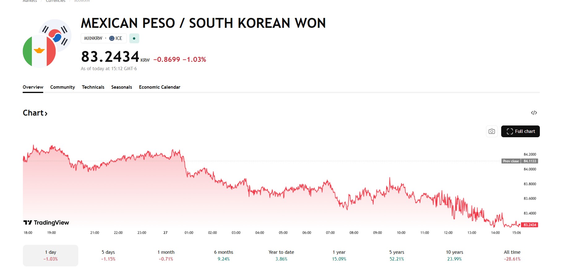 La caída del peso frente al dólar arrastró consigo la paridad con el won coreano. En TradingView, el cruce MXN/KRW cerró en 83.2434, perdiendo casi un won completo en menos de 24 horas.