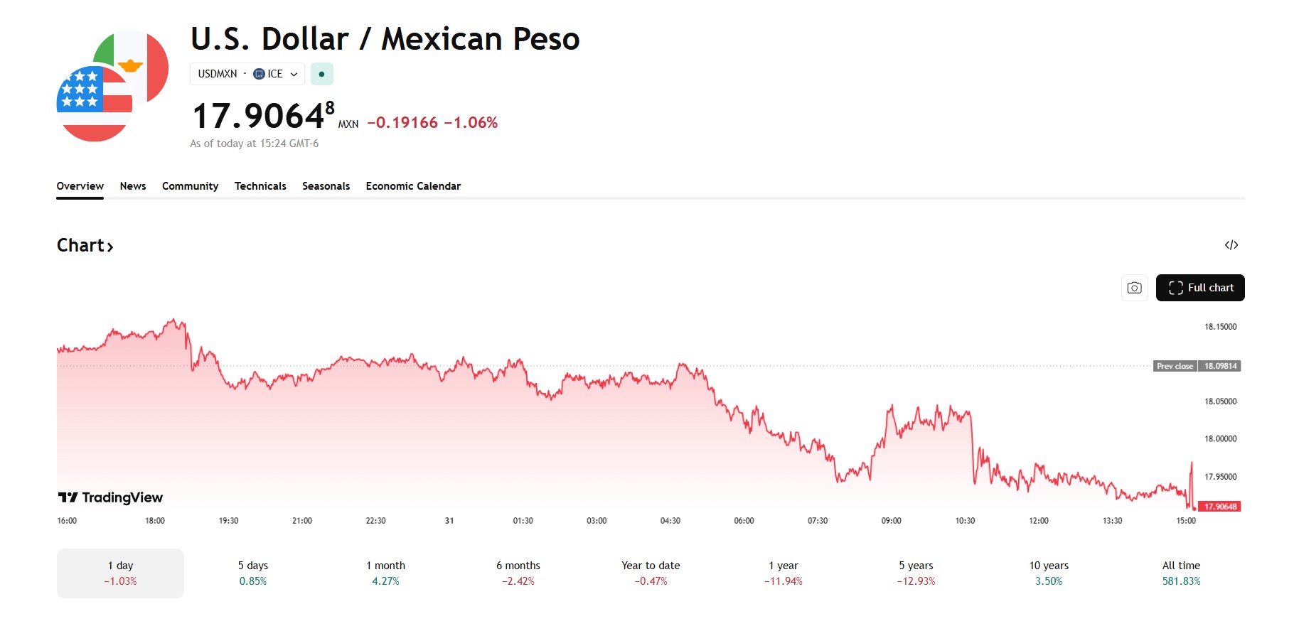El mercado cambiario reaccionó con euforia. Según datos de TradingView, la moneda local cerró en 17.9652 unidades por dólar, una apreciación del 0.88% respecto al cierre previo. Tras haber tocado máximos de 18.16 en la apertura, la divisa se fortaleció luego de que el presidente estadounidense, Donald Trump, sugiriera una posible salida diplomática al conflicto con Irán, lo que desplomó al Índice Dólar (DXY) por debajo de los 100 puntos (99.99).