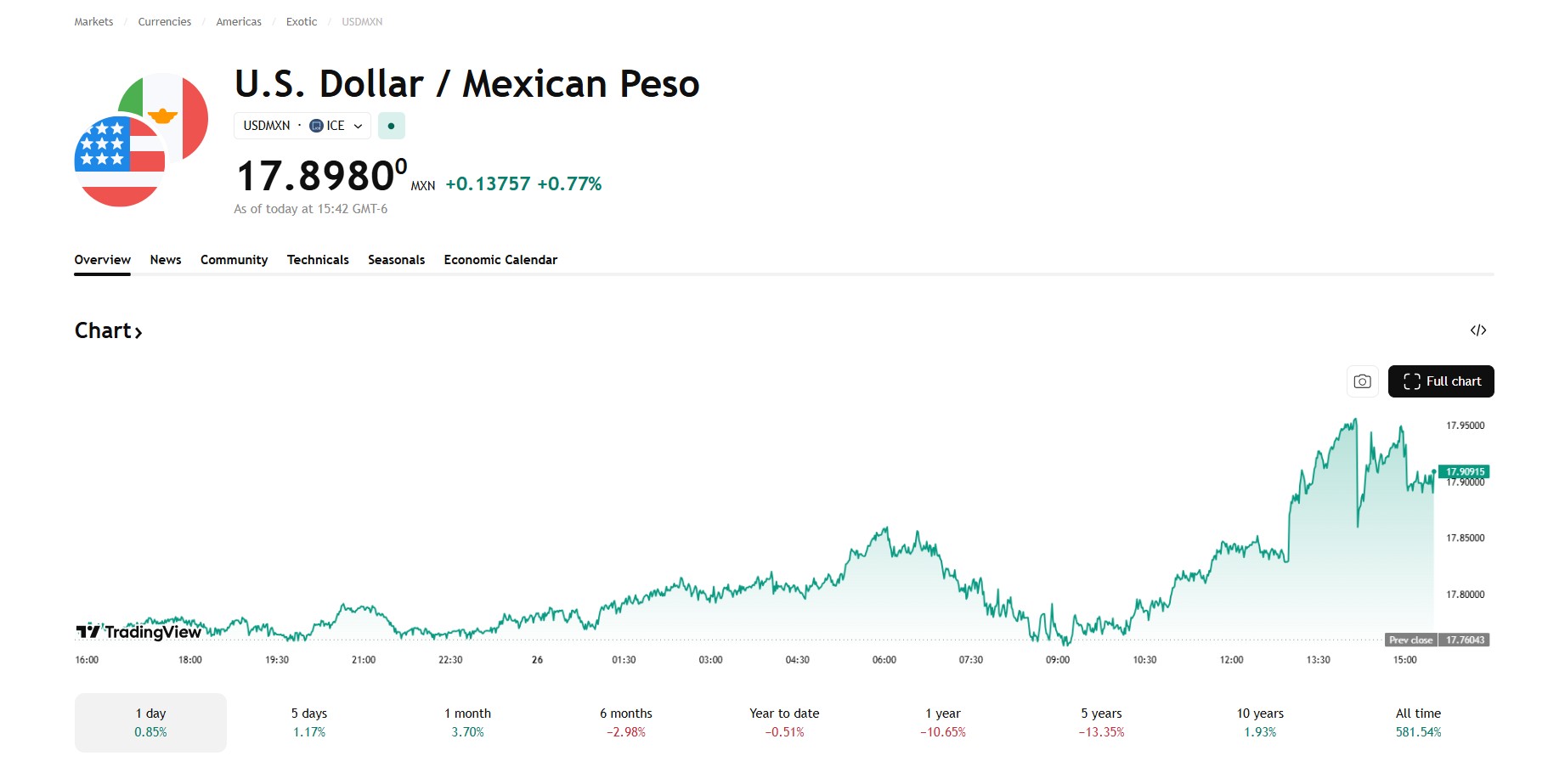 El mercado cambiario reaccionó con violencia. De acuerdo con datos de TradingView, el peso mexicano borró sus ganancias tempranas y se hundió hasta tocar un máximo de 17.91 unidades por dólar.